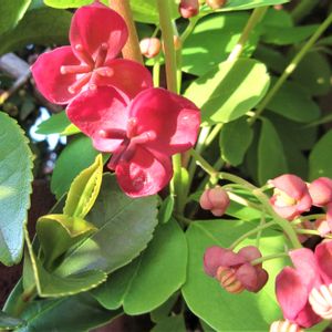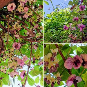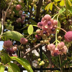 アケビ 叔母の家の庭でアケビの花を見ました。 アケビは知ってたけど、花を見たのは初めて😍 雌雄同株で雄花と雌花が可愛く咲いてました🌸 どっちがどっち? アケビの実はネットから取りました^_^