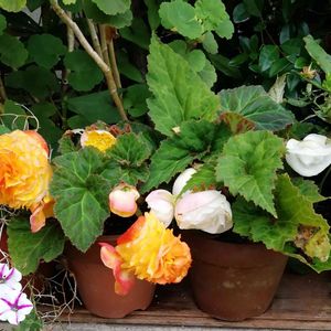 おはようございます😃 ベゴニア三種 満開です✨ 「球根ベゴニア フォーチュン」 前に投稿した時より 花びらがしっかり開き いくつも咲いて 重そう 豪華になりました🎶 一本折れました😅 「八重咲きベゴニア タブレット」 「ベゴニア・センパフローレンス」 どちらも冬越しでき、大きくなりました