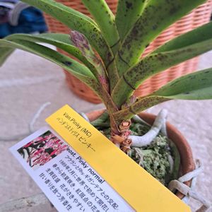 世界らん展2024戦利品①🪴 バンダ SOH-128 ・パピリオナンダ メーヴルL.ヴェルテュイス ・バンダ シュリーゴールド 交配の新品種らしい (多分新品種だから名前がまだない) バンダ育ててみたいから気に入った品種があったらお迎えする!と思って行って、最初はマーケットうろうろしても濃いめの色のものしかないからバンダはやっぱりやめようかな… と思った矢先に見つけた子 淡めのピンクと黄色の複色!!可愛い!!ということでお迎えしました 今年はまだ花が咲かないからちょっと安いんだよね、とお店の方が言っていたけど、長くお世話することで花が咲く方が可愛いから問題なしです☺️ お店にも実物の花は展示されていなくて、タグに付いた写真でしか花を見ていないので株が大きくなってから咲くのが本当に楽しみな子です♡