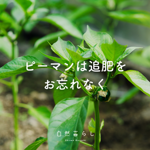 5月中~下旬に植え付けたピーマンは、追加の肥料が必要になる時期です🫑 基本的に定植して20日~30日経過したら、1週間~10日に1回を目安に固形肥料を与えて樹勢(樹の勢い)を維持しましょう。 液体肥料の場合は、2~7日に1回を目安に肥料を与えます。 ⚠肥料焼け&水がお湯になって植物体を傷めることを防ぐためには 真夏の高温時の施肥は避けて、なるべく涼しい時間帯に与えることがポイントです💡 ピーマンの畑・プランターでの育て方詳細はこちら! 《ピーマンの育て方|プランター栽培、肥料の与え方も解説》 https://shizengurashi.jp/blogs/method/greenpepper