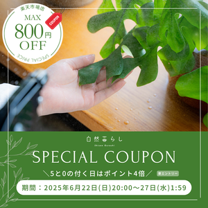📣スーパーSALE開催📣 自然暮らし楽天市場店にて期間限定の大セールを開催中です! 期間:6月4日(水)20:00~11日(水)01:59 セール情報は「詳しく見る」をチェック☑ PCの方はこちらから↓ https://www.rakuten.co.jp/shizengurashi/contents/supersail/ お得情報その① 自然暮らし楽天市場店では 人気商品がなんと【半額】に!👀✨ さらに、【半額】商品の到着後にレビューを投稿すると 「水でうすめるカルシウム液肥」または 「水でうすめる有機液肥」のどちらかの サンプル品をプレゼント! (ご購入時にどちらか1種類をチョイス) さらに500円OFFクーポンもプレゼント♪ 次回のお買い物もお得に! お得情報その② 全商品対象の【10%OFFクーポン】を配布!🙌✨ 気になっていた肥料や土壌改良材を、お得にゲットするチャンスです♪ お得情報その③ 5と0の付く日は【ポイント4倍】!🌱✨ 本日はポイント4倍デー♪ エントリー必須ですので、お忘れなく👍 ⌒⌒⌒⌒⌒⌒⌒⌒⌒⌒⌒⌒⌒⌒ 🌟当店イチのおすすめ 「水でうすめてミストする液肥 3本セット」 スーパーSALEの【半額】対象商品です♪ 観葉植物を元気に育てたい、緑を美しくしたいという方にぴったりの商品です! 葉から肥料を吸収させるため、 ハイドロカルチャーやスポンジなど、 土を使わない栽培をしている場合も お使いいただけます✨ 特に、緑色の「水でうすめてミストするサプリ」は 窒素・リン酸・カリウムを含まず マグネシウム&微量要素で構成された サプリメントのような特殊な肥料! 余分な栄養を与えず、 光合成を促進する優れもの🌱🌞 他の2種類と併用OKです!👍✨