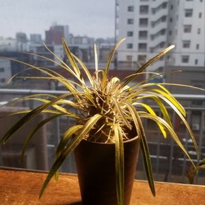 パキポディウムのゲアイー。 強風で葉っぱが・・・😨 しばらく前の強風でもダメージを 受けていたのですが、 今回の風でとどめを刺されました😥 しかし自分のトゲで自ら葉っぱを ボロボロにしてしまうのは なんだかな~😓 ネオレゲリア鉢は倒れるし、 土は飛び散ってむちゃくちゃだし 台風🌀並でした😭