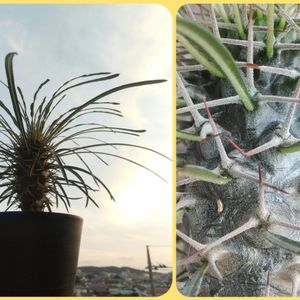パキポディウム ゲアイー 冬の寒さには弱いけど夏の太陽と水が大好き育てやすいゲアイ―です まさに私向けです✌️ 今年の5月に購入 細長い葉がフサフサとなり長くて15cm 丈も一回り大きくなった様な気がする 10cm❗️ 中をのぞくと鋭いドゲ 危ない危ない⚠️