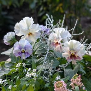 こんにちは😃 昨日の土曜日、園芸店は駐車場🅿️もいっぱいでした☀️ 沢山のパンジーやビオラが入荷していました🌸🌼 ①②③ 寄せ植えを1鉢作りました✨ 🌸パンジーパスフリ 🌸アリッサム、 🌿プラチーナ パンジーパスフリは初めてお迎えしました✨優しい色合いに魅かれました☘️ ④先日、別の園芸店で買ったプレートです🪧園芸雑貨も欲しくなりますね☘️
