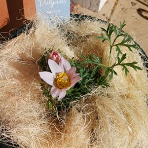昨日の 西洋翁草。 ふわふわの ココナッツファイバーを土の上に✨ リングバスケット。穴だらけに😅 蔓で補強して いらないフキンで側面をガード🙌 先日買った 一般ジーちゃんで 寄せ植え完了♥