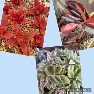 おはようございます😊 火祭り(左上) 徒長した火祭りを挿し芽にしていたら真っ赤かに 右上のデザートローズは土の中から子株が現れ そちらも赤く色づきました 下のベビーサンローズは縁がピンクに色づき 綺麗にお化粧しています 今日から寒くなるので昨日に室内へ 今度は色が褪めるのでしょうか?