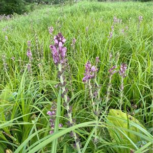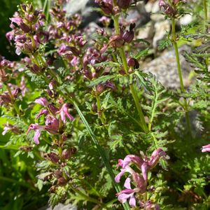 ヨツバシオガマ(四葉塩竃) *ハマウツボ科シオガマギク属 花期は6〜8月 東北地方南部.月山〜中部地方以北の亜高山ー高山帯の草地に生える! 高さは20〜50cm シダのような葉は茎の節ごとに4輪生し、名前の由来となっています。 茎頂に紅紫色の総状花序を2〜7段輪生状につける。 花冠は2唇形で、下唇は3深裂。 上唇はまるで鶴の頭のような形で、嘴の先から雌しべがつき出ています。 花は下から咲き出しますが、上部の花が咲く頃には下の花は果実となるようです! 7月27日撮影