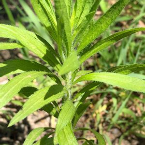 姫昔蓬 🌱🌱ヒメムカシヨモギ 🔍庭草観察🤗 夏草も暑過ぎて中々大きくならない⁉︎ ①茎に白い長い毛、②葉の縁と裏の主脈に毛。葉の裏面はザラザラ。 ③規則的に並ぶ葉。④下葉はペタンと垂れない