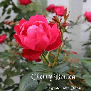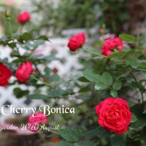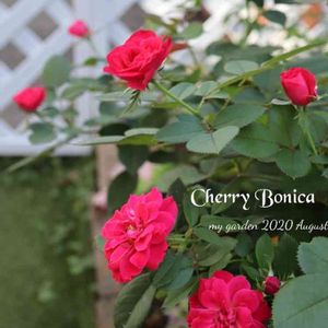 今朝のチェリーボニカです。小さなコロンとした可愛らしいバラです。とっても花持ちがよくて、最後までほとんど退色しない感じで、綺麗に長く楽しめます。白い子フェンスには赤は本当によく映えますね。