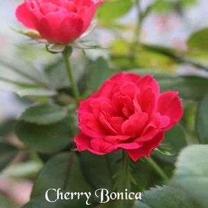 チェリーボニカです。親指と人差し指で丸を作ったくらいのお花の大きさです。背が高くならず、とても病気に強いバラです。良く咲いて可愛らしいです。