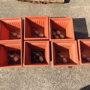直径44cmの睡蓮鉢です。次々と新芽が出てきてます。黄色の花が咲く予定。夏が楽しみ〜♪♪♪
