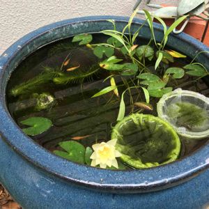 めだかの鉢の睡蓮が咲きました😊 隔離している子めだかたちも元気に育っています!