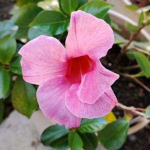 サンパラソル ミルキーピンク ツルが伸びにくいタイプなので、支柱無しでそのまま育成中😊 サンパラソルを含むマンデビラはツル性なので、ツルが伸びにくいのは珍しいなと思います😲