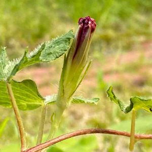 『団十郎アサガオ (黄蝉葉栗皮茶丸咲大輪)きせみば くりかわちゃまるざき たいりん』 ※江戸時代に二代目市川団十郎が海老茶色の衣装を好んで着用し、その茶色が団十郎茶として流行り、その色をした朝顔なので通称「団十郎朝顔」と呼ばれたと言われています。正式な花名は『黄蝉葉栗皮茶丸咲大輪』です。「黄蝉葉」は黄色い(濃い緑色ではない)蝉葉という意味。斑も入りません。略して「キセ」と呼ばれます。 蝉葉というのは、葉の左右の翼片がそれぞれ1~3枚前後に裂開し長く伸び、主片の中央がふくらみ、まるでセミが翅を広げたような形状の葉のことです。 「栗皮茶丸咲大輪」は栗皮茶で丸咲の大輪の花という意味。栗皮茶が団十郎茶の色で、丸咲は花の形が丸いという意味で、大輪はそのまま花の大きさを表しています。※今年の一番花🌸