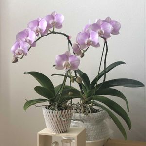 🩷♡ミディ胡蝶蘭の親子♡🩷 切り離した子株が咲きました🙌ヤッター 後ろが親株、手前が子株 お花はまだ一回り小さめです ①親子 ②③子株 ④⑤親株もうすぐ満開