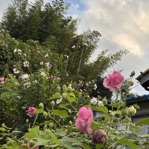 色づく時╰(*´︶`*)╯♡。🩷🌸🩷八重、一重、ムクゲがお迎えしてくれる。車🚙〜。泣き出しそうな空を見て慌てて撮りました。😅💦 芙蓉は花が多くてすでにうなだれてます。🫢ウラムラサキがモリモリで嬉しい💜😍