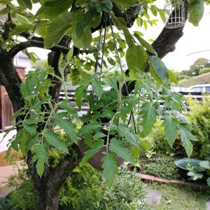 チョット変わったチャレンジ ①ハンギングに、トマトの苗を植えて育てています。 勝手に生えてきたもので、適当に地植えしていたものは成長が悪いけど、意外にもハンギングの物が1番成長良い!愛着湧くフォルムで、お気に入り。 ②ヒマワリがスクスク成長し、アサガオの、アーチを越えました。アサアーチが、支柱代わりになって、ここから何処まで伸びるか楽しみ。