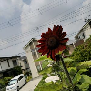 ヒマワリが咲きました! 赤いひまわりカッコいい!