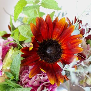 5月の初めに種まきしたひまわり「クラレット」が咲きました。 切り花用に、と思っていたのですが、定植した間隔が広すぎたようで(20cm程度)こんなにたくましくなってしまいました…。 それでも、個性的でとっても素敵です。 ※種はタキイの「F1 クラレット」です。通販で買いました。