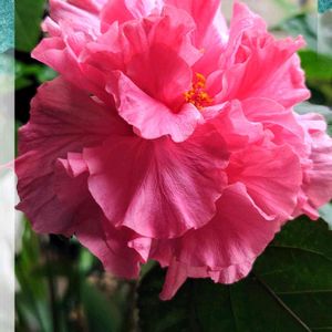 沖縄 伊江島ハイビスカス🌺コナ 初めての開花です(≧∇≦) 八重咲きの小ぶりな花 パールピンクが美しいです(#^.^#)♥ ハイビには珍しく 中央の葯が見当たりません😀取れちゃったのかもしれません💦 可愛いです😀