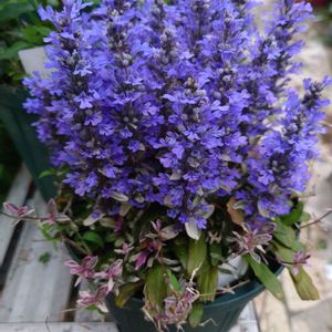 鉢に一時植えたアジュガが ギュッギュッとまとまって 咲きました。