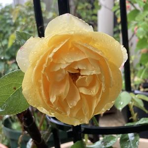 グラハムトーマスが咲きました 私の好きな黄色のイングリッシュローズです 今日大雨の中撮りました 昨年枯れたようになっていましたが幸運にも復活しました 大事に育てたいと思います