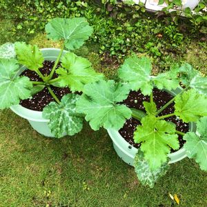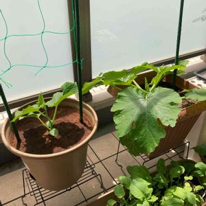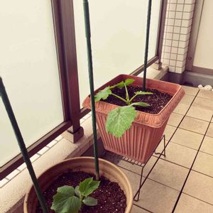種から育てたキュウリ苗、鉢に植えました。 先週植えたズッキーニも、順調に育っています🌱
