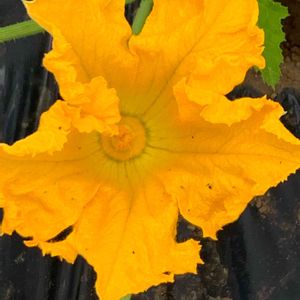 昨夜の嵐に耐えて、畑のズッキーニ、ゴールデイーの雌花が咲きました。 ゴールディーはソフトボールぐらいの丸型で、オレンジ色のズッキーニです。 雌花が咲いても、雄花は畑中探してもまだありませんので、花合わせはできません。 したがって、ズッキーニの実にはなりません。