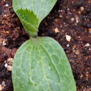 ズッキーニ。 発芽した苗を、今は1つずつ鉢に移して管理しています。 日向に置いた苗の方が生育がいいです。