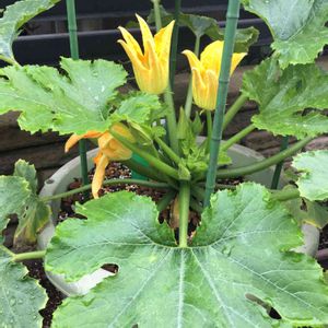 今朝見たらズッキーニ の雌花に加えて雄花もふたつ咲いていました👍😊☀️ さっそく雄花の花粉を綿棒で雌花の雌しべの上につけました✌️ 大きく実ってね!🙇♂️