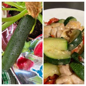 家庭菜園のズッキーニ収穫😆 今回は花ズッキーニもとれた♡ ふた株植えて8本とれたら、うちにしては上々🎶 あ、このゴツい手は私ではなく家庭菜園担当オットの✋せっせと朝受粉した成果にご満悦😆
