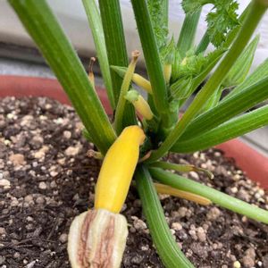 今晩は、毎日暑いですね☀️ ズッキーニのきいろくんです。 やっと実が大きくなってきました✨ 奥の方に赤ちゃんズッキーニも出てきました。上手く大きくなってくれるといいなぁ💫