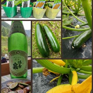ズッキーニ💚 5月8日に植え付けて、約1ヶ月、初物getしました❣️ まずはウインナーと一緒に、ガーリック&オリーブオイルで炒めていただきました😋サイコ~ あれれ? 一升瓶が1番大きく写ってる〜😅😂🤣
