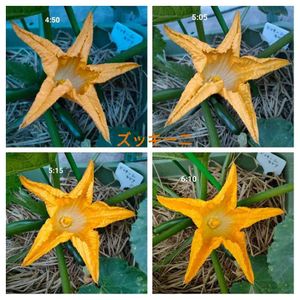 おはようございます🌄 今朝は夜明け前に起き 観察🥒 夜明けと共に開花するのね 緑のズッキーニは5:15がピーク 星型のまま 昨日の黄色はふっくらしてたのに そして今日も雌花😆 下に二本受粉できなかった キュウリみたいな実があるでしょう😄 雄花のツボミもあるので受粉の仕方を投稿からお勉強しておこう🤔