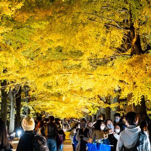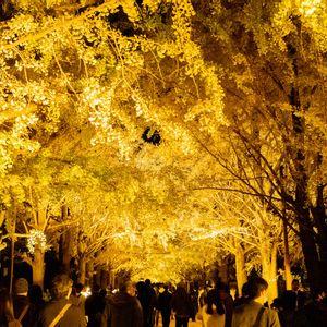 国営昭和記念公園5 銀杏並木のライトアップです。ライトが黄色のため人も黄色く映ってます