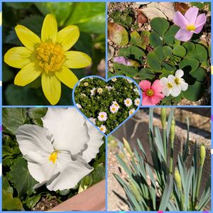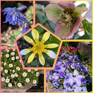 本日2枚目の投稿です🤗 左上 スプリングビューティー左下 ノースポール 右上 クリスマスローズ 右下 パンジー 真中 ヒメリュウキンカ
