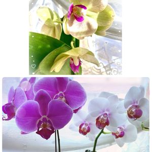 ミディ胡蝶蘭🥀✨ 上は1ヶ月前にお迎えした株…まだ綺麗💕 下は先日お迎え♬✨ 去年のは蕾で中々咲かないので待ちきれず😆 ②枚目は1ヶ月前のお色と現在の違いです✿︎ オレンジぽかったのがグリーンぽくなりました💛💚