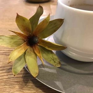お花屋さん併設のカフェで、コーヒーにリュウカデンドロンが添えられてきました