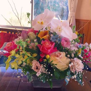 今月は母の誕生月なので、 お気に入りの花屋さんで アレンジメントを作ってもらいました(^^)