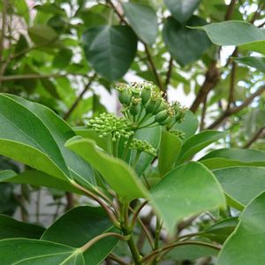 カクレミノが開花しているのに気がつきました❗ 小さくて、なかなか気がつきにくい花です…。 花が咲いたあとに、黒い実ができます❗