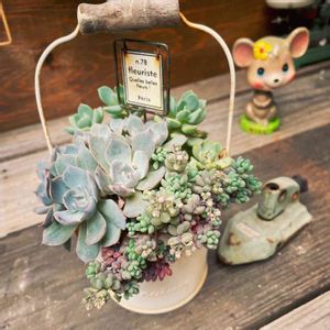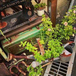 ちまちま寄せの左3つは陶芸体験で作った自作の鉢です。ちまちま寄せをしようと思って作りました。 アテナータを植えてるのはペンキ屋さんに貰ったリアルなペンキ缶です。ペンキの垂れ具合がJunkでお気に入りです。 奥のおひとり様は個性豊かな物が多いので素焼鉢やモスポットでシンプルに植えてます。前に出しゃばってる月花美人がどこまで支えずに前に出てくるのか見守っています。 水色の小さな車輪仲間入りしました。 お気に入りのガラクタガーデンです🥰