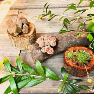 DAISO の虫の餌入れにリトープス植えました。森の中の切り株からきのこが生えてきたイメージ🍄 🍄 りときのこ と名付けます☺️