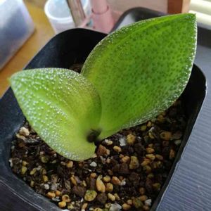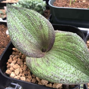 愛智園の『プスツラータ』。 このプスツラータさんはマッソニア属の球根多肉さんになります(*´꒳`*) プスツラータさんは左右に小さなツブツブと模様が入った楕円形の可愛い葉を2枚出しているのが特徴です! よくプスツラータさんはロンギペスさんとも呼ばれたり、細かい情報がなかったりでハッキリとしないですが、プスツラータさんもロンギペスさんも同じであると言われています。 ただPacific Bulb Societyという海外のところによるとロンギペスさんは雄しべの花糸がピンク色をしているとされています。 なのでプスツラータさんとロンギペスさんは地域による違いがあるだけで同一種である可能性が高いとされています(๑˃̵ᴗ˂̵) 育て方は普通の多肉さんの育て方を軸に考えます。 置き場所は春秋冬は日光のよく当たるところにおいてあげます。ですが春ごろから初夏に葉が枯れてきたら日光があたらない涼しい日陰などにおいて夏を過ごさせてあげてください(๑˃̵ᴗ˂̵) 風通しは他の多肉さん同様に1年を通して確保してあげてください! 水やりは春から初夏に葉が枯れてきてからは秋まで断水気味にします。 ですが小さな球根さんは体力がなく夏を乗り切れない場合もありますので、そのような子には30度にとどかない日の日没後に土の表面が湿る程度水をあげてください(^_^*) そして秋になり涼しくなってきたら水やりを始めてください!ですが夏が過ぎてからどのタイミングで水やりを始めていいかわからないという方もいますので、その時は葉っぱが出てきてから開始してもらえれば間違いないです(*´꒳`*) 冬は土の表面が湿る程度に1ヶ月に3、4回ほど 水を与えてあげられれば大丈夫です(*´꒳`*) 温度管理は暑さが嫌いなので夏は日陰と風通しで涼しさを与えてください(。・ω・。) そして冬は寒さに強いですが、霜などにあたるのは良くないため5度を下回るようになったらお部屋や温室に避難させてあげてください(๑˃̵ᴗ˂̵) プスツラータさんはマッソニア属の代表的な子であり、また球根多肉さんの代表的な子でもあります(๑˃̵ᴗ˂̵) そしてお花は可愛く、いい匂いがしてとても癒されます(о´∀`о) 最近ではホームセンターなどでも待っていてくれてることが多いです(*´꒳`*) なのでもしお店などでお気に入りの子に出会えましたら、是非家族の一員に迎え入れていただけたらなと思います(๑˃̵ᴗ˂̵) 話はかわりますが、皆さんあけましておめでとうございます!! 去年は少しハプニングがあり投稿出来なかった時期がありましたが、沢山見ていただきコメントをいただき多肉さんサボテンさんと幸せな時間を過ごさせていただきました(*´꒳`*) なかなかコメントを返せていなかったり、時期によってこれからも投稿が少なくなることはあるかもですが出来る範囲で多肉さんサボテンさん達と皆さんと楽しく癒しのある時間を過ごせるような1年にしたいと思っております。 2019年もまだまだ未熟な愛智園ですが、どうぞよろしくお願いいたします(*´꒳`*)