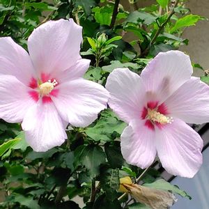 庭のムクゲ❗ 十年くらいたち、ようやく花がたくさん咲くようになりました🩷🩷🩷😄 ただ、花殻が道路に… 朝夕2回、掃除です😅