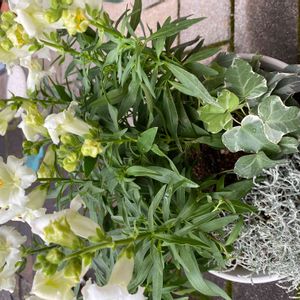 白い金魚草がきれいでお連れしました✨✨アイビーとプラチーナ⁈を足下に据えたのですが、うーん、なんか違う気がする😅勉強します😁
