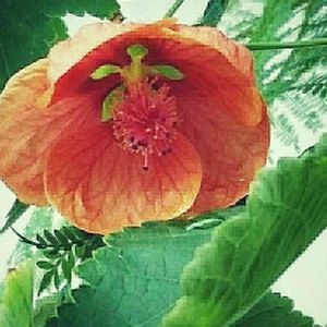 オレンジ色のアブチロン 可愛い花ですよね〰️😊 コロンと咲く姿がね〰️💞 横から見ても可愛いけれど 今日は、下からのショットです😀✨