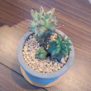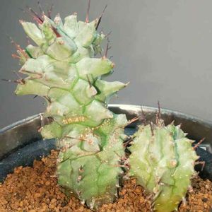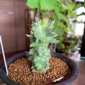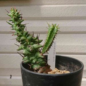 ユーフォルビアの宇陀ホリダモンスト。ここからどう成長していくのか想像がつかない。更に群生するのか、茎が伸びていくのか。 昨夜、持ち運びで棘らしきものが2、3本折って取れてしまったが、それも気にならないモンストっぷり。取れたところから白い液体。触ってみたが、少し粘り気。かぶれることがあるらしいから手洗いしておいた。