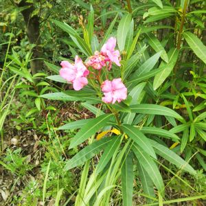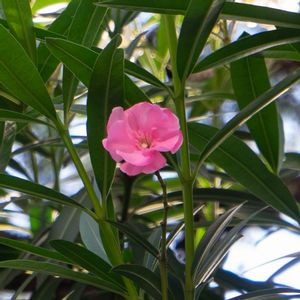 8/6㈯① キョウチクトウ 夾竹桃 ピンク 今日のお花のキョウチクトウ 大船フラワーセンターに7/9に3色咲いていました。 連投しますので、コメント欄は3枚目に開けることにして、1枚目2枚目のコメント欄は閉じさせて頂きますね😃 ピンクのキョウチクトウは八重咲きを見かけることが多いです。前に一度だけ、一重咲きのピンクを見ました😄💗💗 花は桃の花に似ていて、 葉は竹の葉に似ています。 「夾」の意味は2つのものに挟まれる、または2つのものが混じる 夾竹桃…竹と桃が混ざる植物…似ているところがある植物 という意味です😉