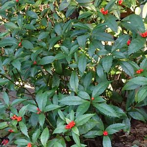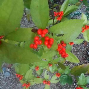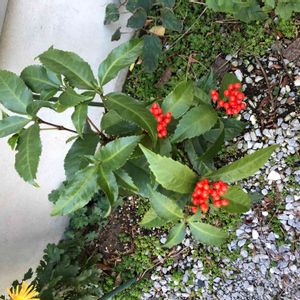 冬の庭 苗を買ってから 5年目の千両です 毎年ちょっとづつ 大きくなってます 鳥対策をして 初めて収穫?できました^_^