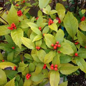 センリョウがあちらこちらで色づいてきました。 黄色と赤の実を窓辺に💕